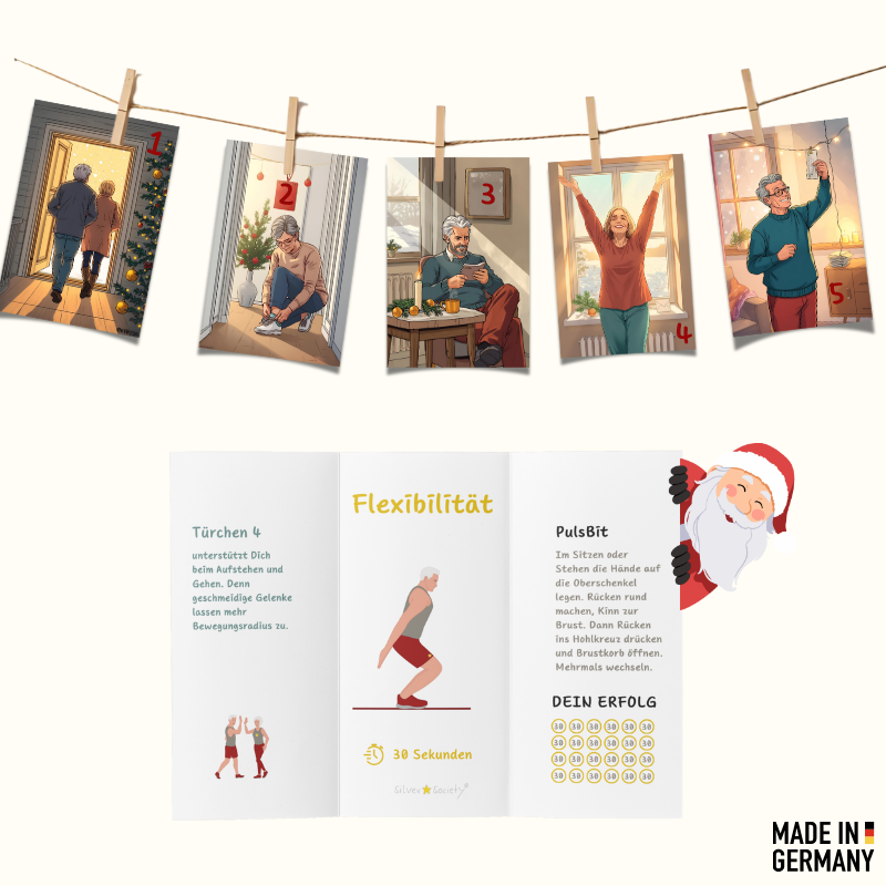 Schon mehrmals 2-3 Minuten täglich reichen aus, um Deinen Kreislauf zu aktivieren, Muskeln zu kräftigen, Gelenke zu mobilisieren und das Gleichgewicht zu verbessern. So bleibst Du in Bewegung – einfach, motivierend und nachhaltig.
